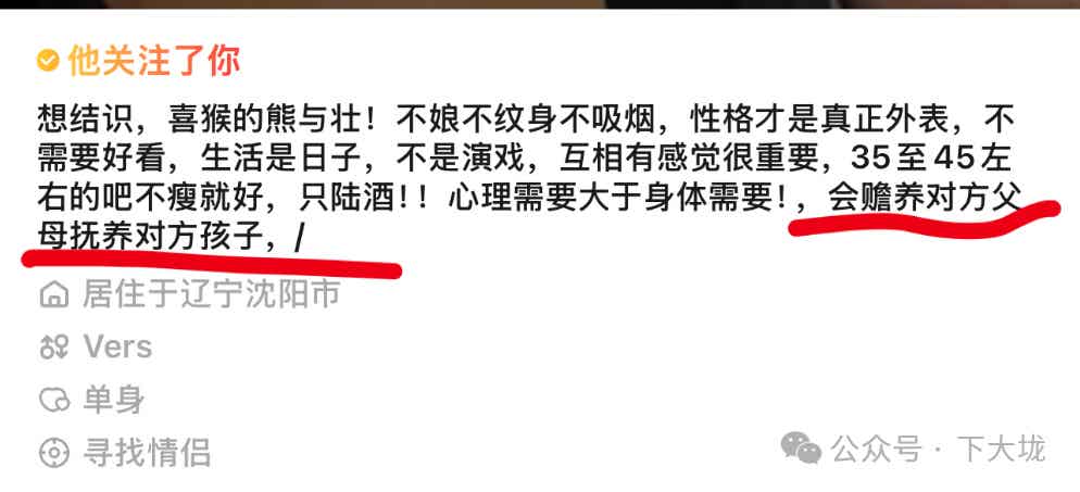 网传的截图不知道的以为这是在58同城找保姆呢,谁会想到这竟然是在翻咔上找对象。当然,他敢写表示勇气可嘉,至于能不能找到这种免费的保姆,那就另当别论。现代恋爱推崇自由、平等、相互尊重,在gay圈更是如此。如果双方没有出柜的话,见家长更是不可能的事情。像上面这个沈阳的gay,他有孩子,还要求另外一半赡养他的父母,可见他大概率是出柜了的。如果有人真的非常喜欢他,愿意爱屋及乌,替他抚养孩子和照顾他的父母,那只能说明他运气好。可是,这样的情况在现实生活中毕竟是少数。在我身边,就有过类似的真实案例,一旦牵扯到孩子和父母时,很多基友都会选择分手,因为他们认为这不属于他们需要承担的责任和义务。我在长沙曾认识一对同性情侣,他们年龄差距不大,好像在一起恋爱的时间有两年多。恋爱期间,他们没有传出什么不合的传闻,他们偶尔也会在朋友圈晒下照片,但都比较隐晦。根据我的观察,1晒的比较多,0很少晒合影。直到有一天,我听说他们分手了,而且闹得很僵。主要的矛盾点是,0在父母的催促下决定形婚,要欺骗家人完成仪式。1好像和家里出柜了,所以没有这方面的压力。尽管如此,他们还是决定共同面对这一难题,正在商议0形婚之后,他们该如何保持现有的同居关系。