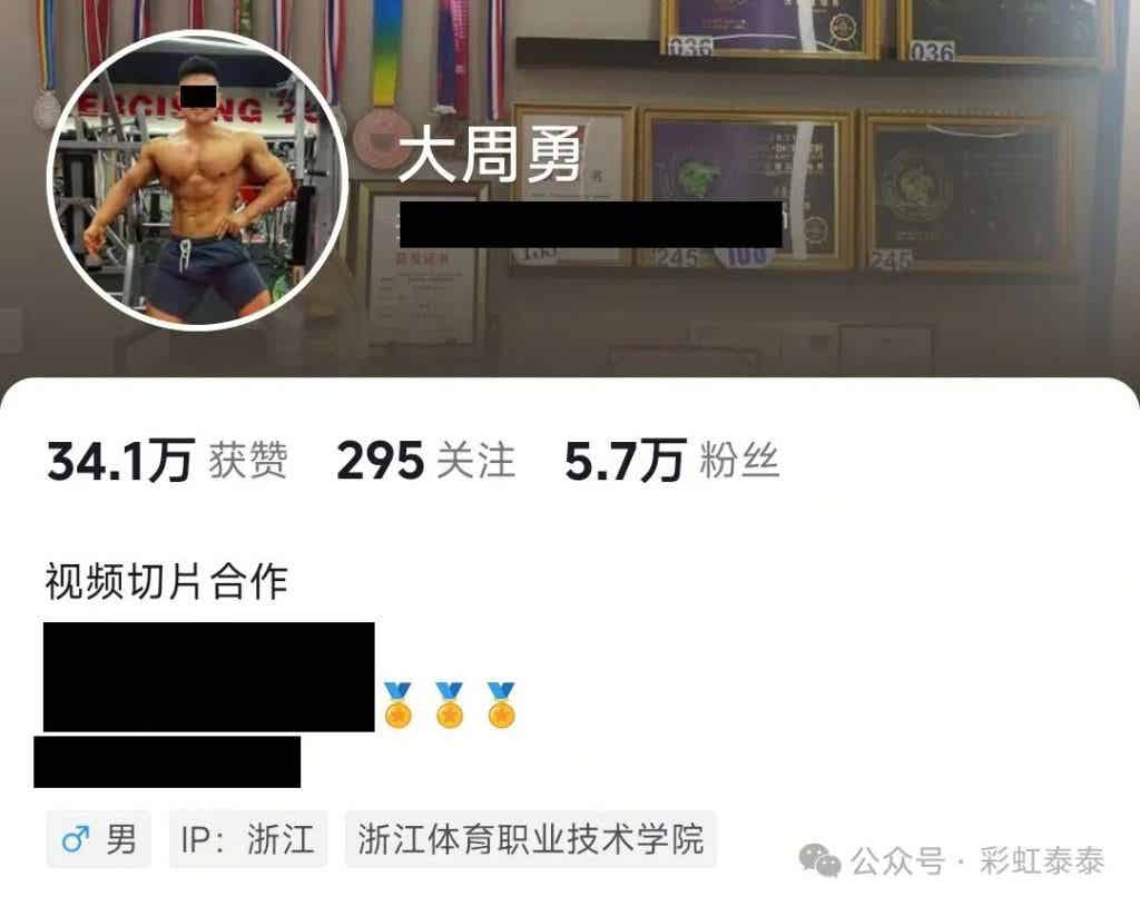 先来了解一下大周勇,根据抖音主页的信息显示,他现在拥有5.7万粉丝,是一位直男健身博主,经常发布在健身房锻炼的视频。资料还显示,他毕业于浙江体育职业技术学院。