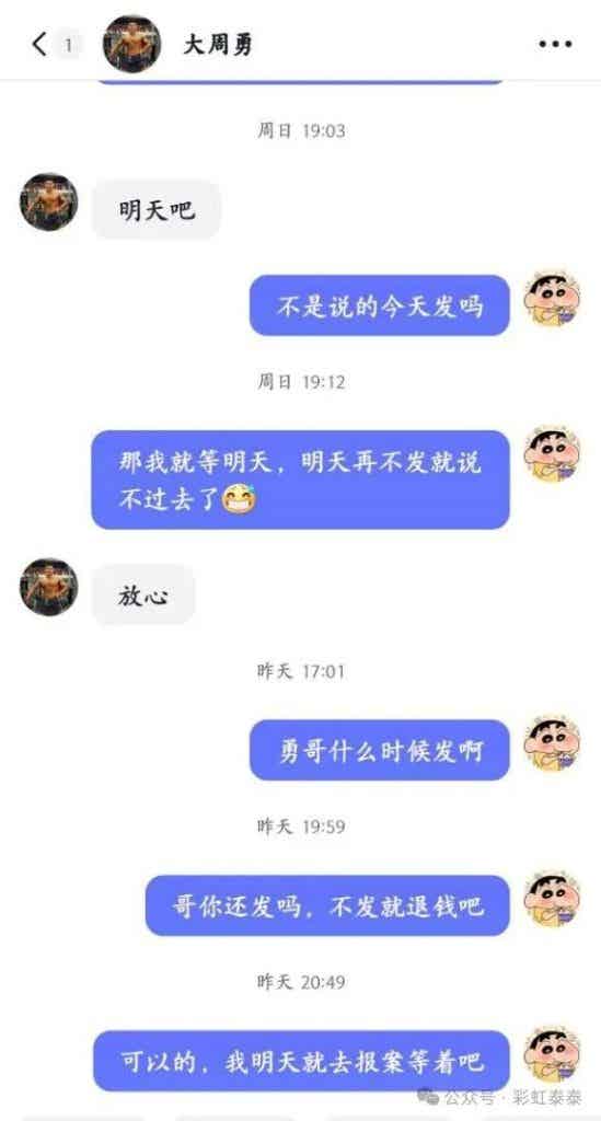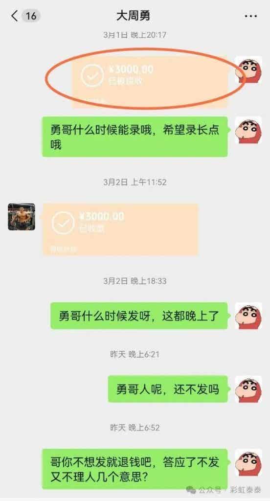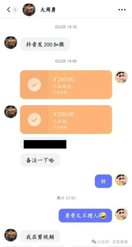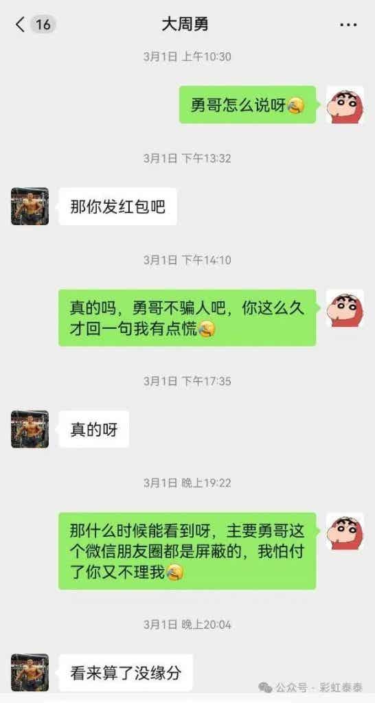 据彩虹泰泰了解到,后来该基友在抖音私聊中告诉大周勇,如果他不退钱的话,就会选择去报案。随后,该基友通过网络揭发此事,一些基友认为大周勇的做法太过分,认为他就是故意在诈骗,纷纷跑到大周勇的抖音下留言。