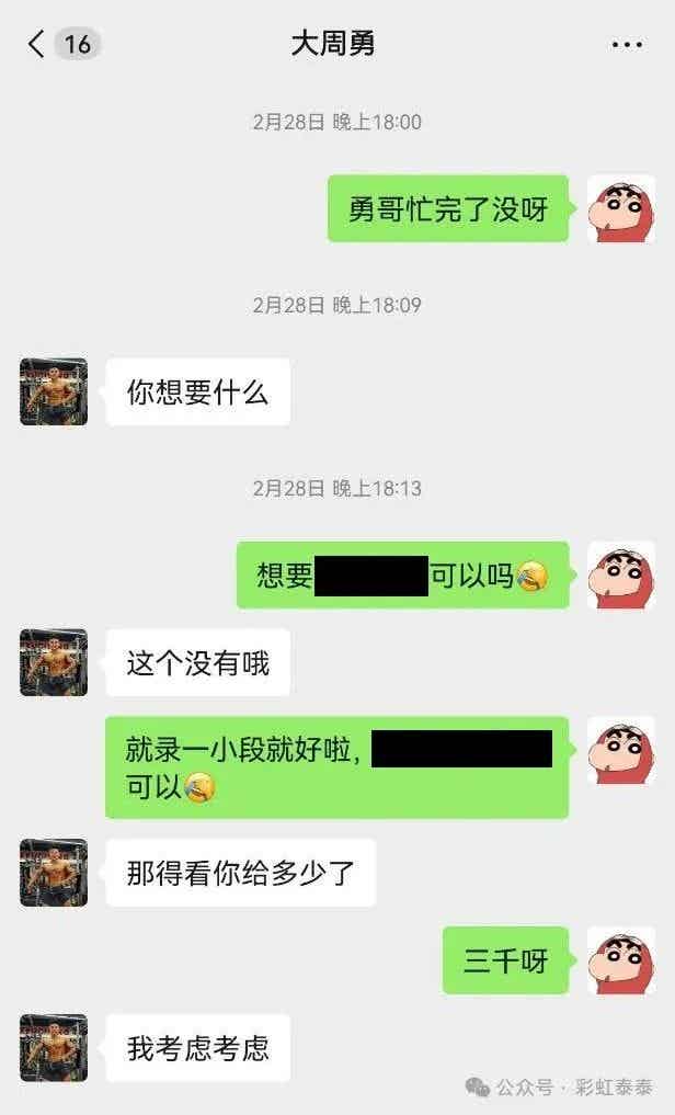 微信聊天记录对话显示,2月28日傍晚,该基友提出,想要购买大周勇的私密健身视频。大周勇先是表示没有,随后又说“那得看你给多少了”,该基友表示愿意支付3000元,大周勇则回应说他考虑考虑。