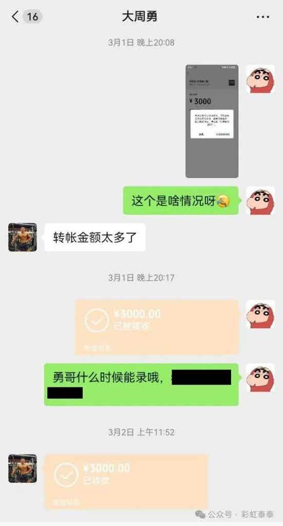 果然,这一招很奏效。3月1日晚上,基友主动给大周勇转账3000元,就在转账时,微信支付还弹窗提醒有风险,大周勇解释说这是因为转账金额太多了。当晚深夜,大周勇收走3000元之后就玩消失,再也不回复消息。