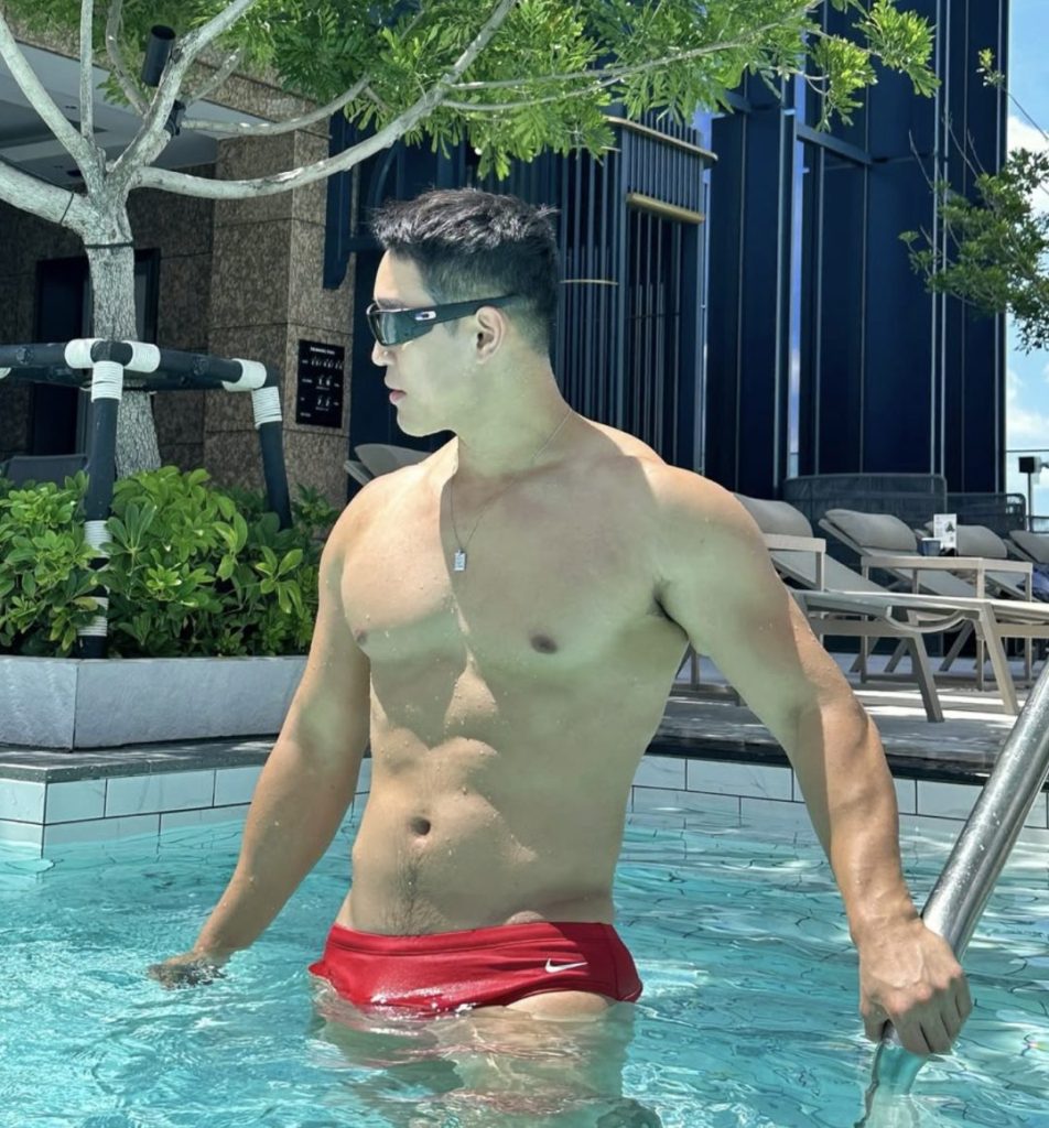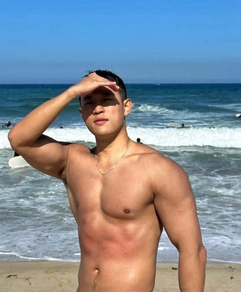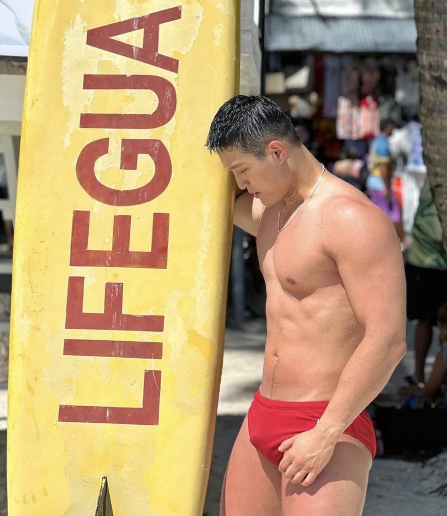 这穿红泳裤的照片,直接是把荷尔蒙指数拉满了。清晰可见的腹肌,肉壮健硕的身材,这种看起来憨壮憨壮的长相,真的没有什么抵抗力!