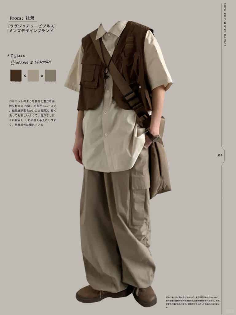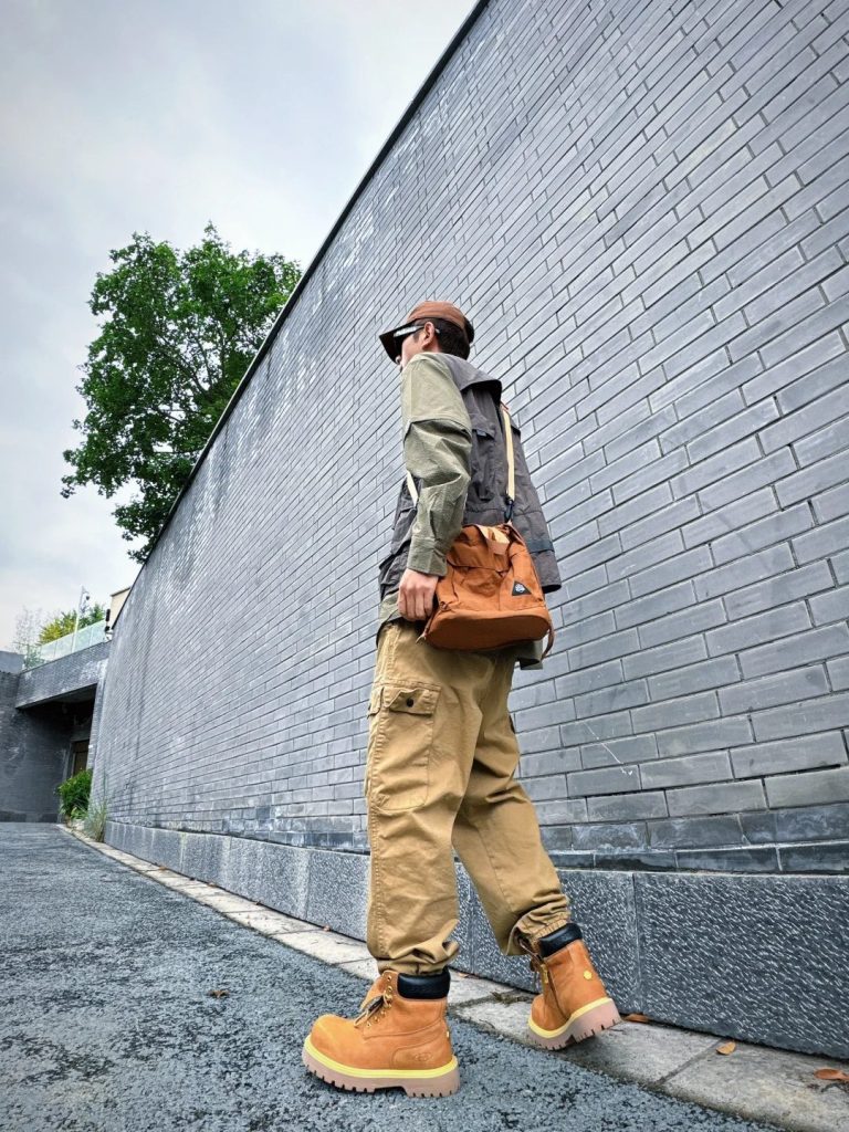 • 工装马甲衬衫 + 直筒卡其裤 + 厚底运动鞋 + 斜挎包