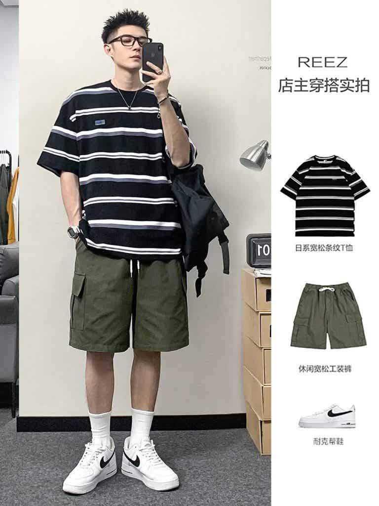 要点:短裤长度在膝盖以上,上衣选竖条纹显瘦。