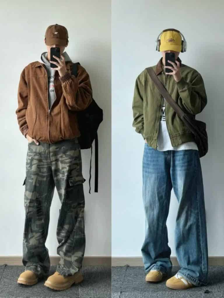 :搭配工装裤+高帮鞋,硬朗有型,适合微胖或骨架小的男生