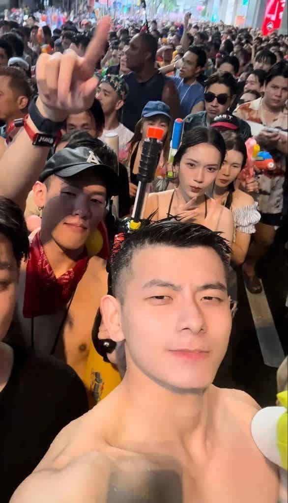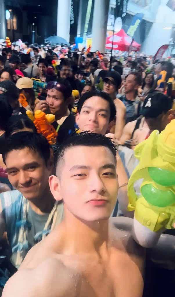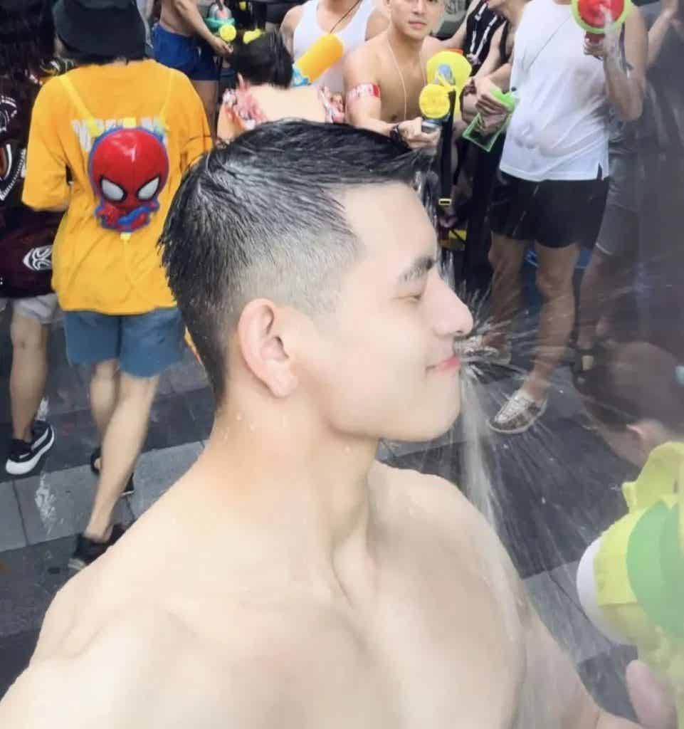 最要命的是,他皮肤真的很白。大太阳底下,仿佛自带反光板,再加上一张让人忍不住多看几眼的帅脸,哪还有什么“低调”可言?在人群中,他像是天选的泼水目标,走到哪都有人笑着朝他泼水,泼得他全身湿透,头发、眉毛、肌肉线条都挂着水珠,居然越湿越帅。