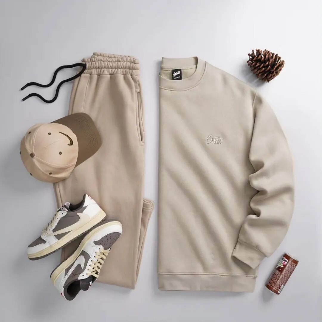 灰色卫衣沉稳大气,白色卫裤提亮整体造型,避免沉闷感;搭配黑白撞色板鞋,经典的黑白配色提升造型的时尚度,简约却不失格调,适合多种日常场合,轻松打造休闲活力形象。搭配3:浅棕色卫衣+浅棕色卫裤+棕色板鞋