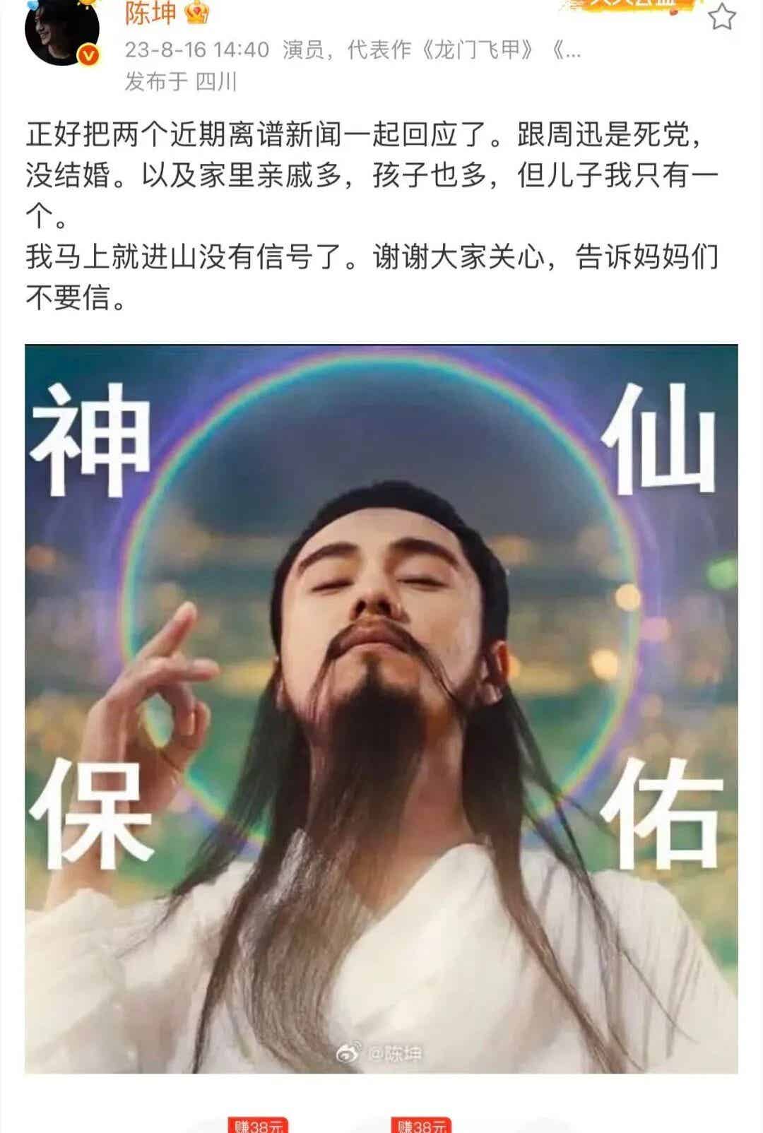 10月18日,陈坤的粉丝会微博发出消息说,“两年前,陈坤已澄清过是亲戚家的孩子,请转发到相亲相爱的一家人,告诉妈妈们不要信。”还晒出一张微博截图,那是陈坤在2023年8月发出的一条微博,上面说:“正好把两个近期离谱新闻一起回应了,我跟周迅是死党,没结婚。以及家里亲戚多,孩子也多,但儿子我只有一个。”
