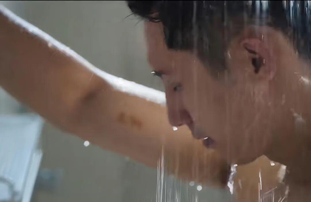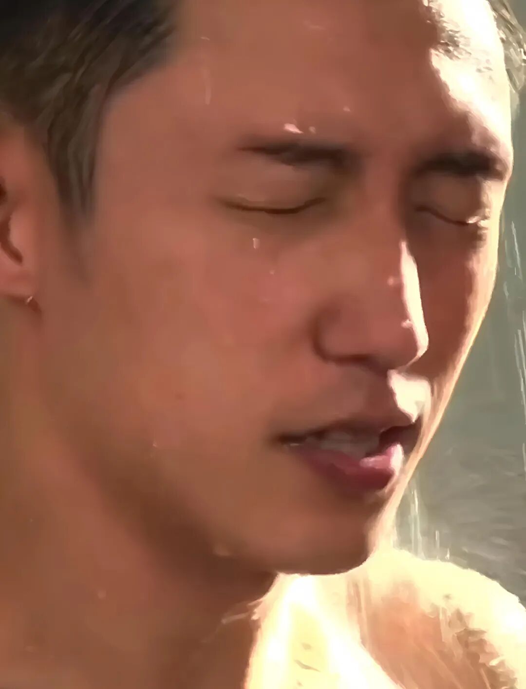 饱满胸肌在水幕冲击下震颤的弧度,是力量美学的黄金分割;鲨鱼线沿腰腹斜插而下的利落收束,宣告着体脂战争的彻底胜利。更致命的是那浸透野性:湿发凌乱贴额间,水痕在腹肌沟壑蜿蜒如神秘符咒——这哪里是沐浴?分明是战神在凡间的濯刃仪式!