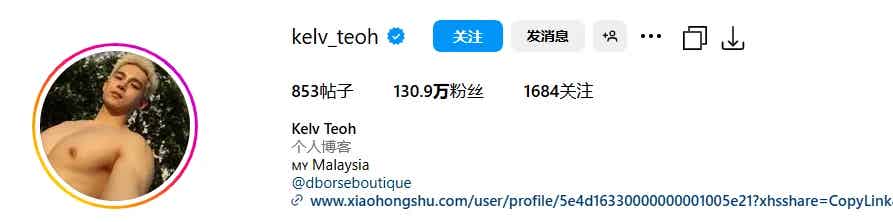 这位小哥哥来到小红书已经四年了。无论是在小红书还是 FB 亦或是 IG,小哥哥早期的照片含肉量还是挺高的。小哥哥在小红书上的昵称是草食男KELV,他的小红书号是 kelv_teoh。由于是马来西亚人,小哥哥平时在 FB 和 IG 上也是挺活跃的,而且发文的尺度也大了些。他在 IG 的粉丝也是百万级的。小哥哥的 FB 和 IG 账号可见下图。