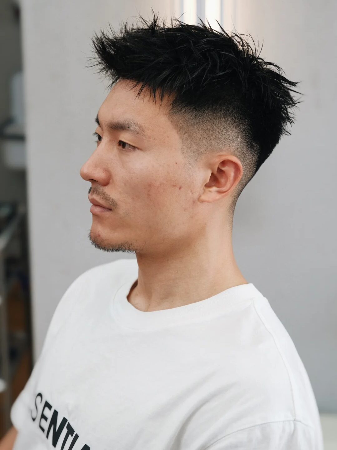 这款发型比起传统普通的平头来说,造型没那么随意,显得更加有设计感与线条感。