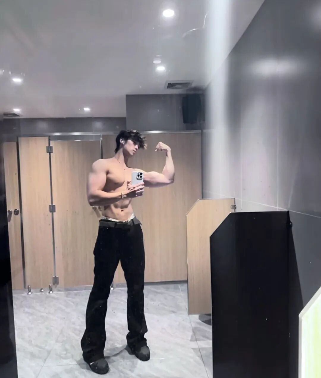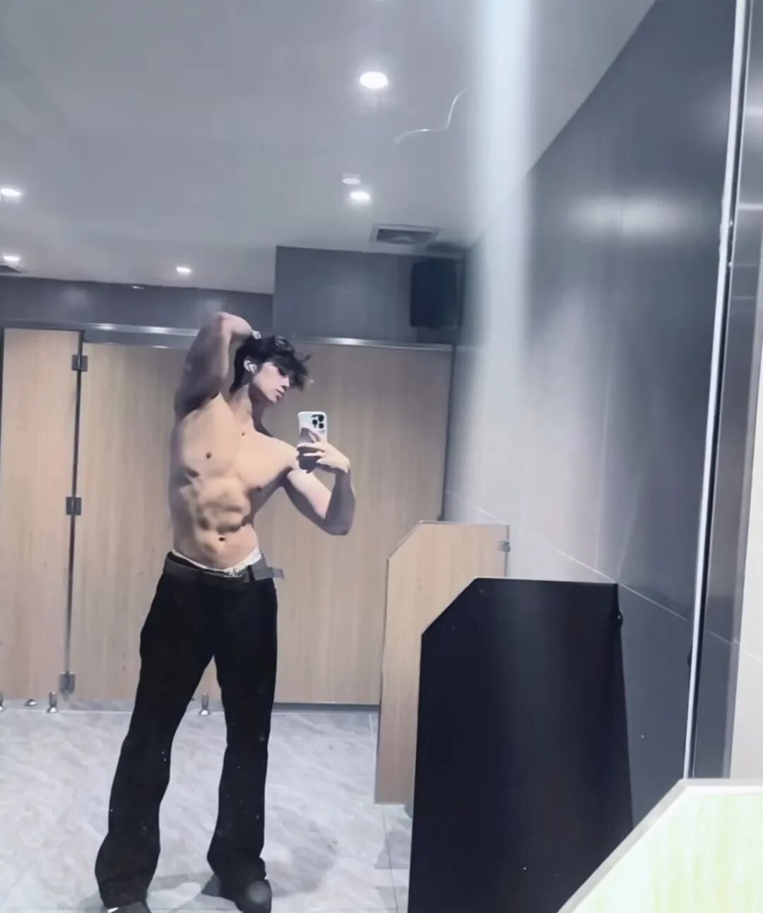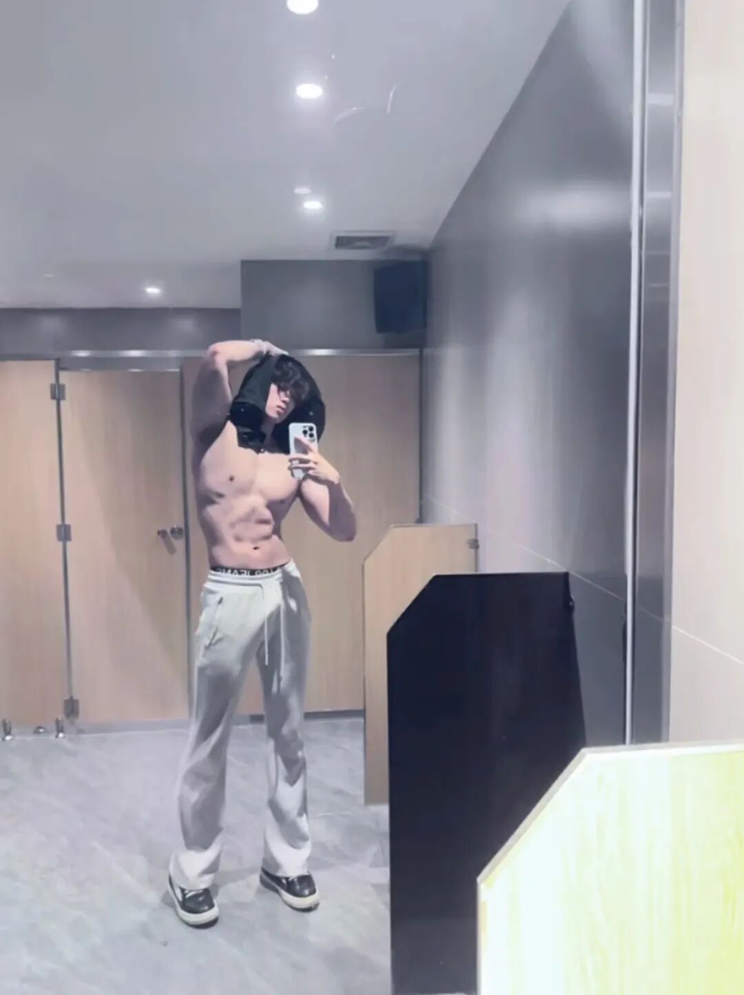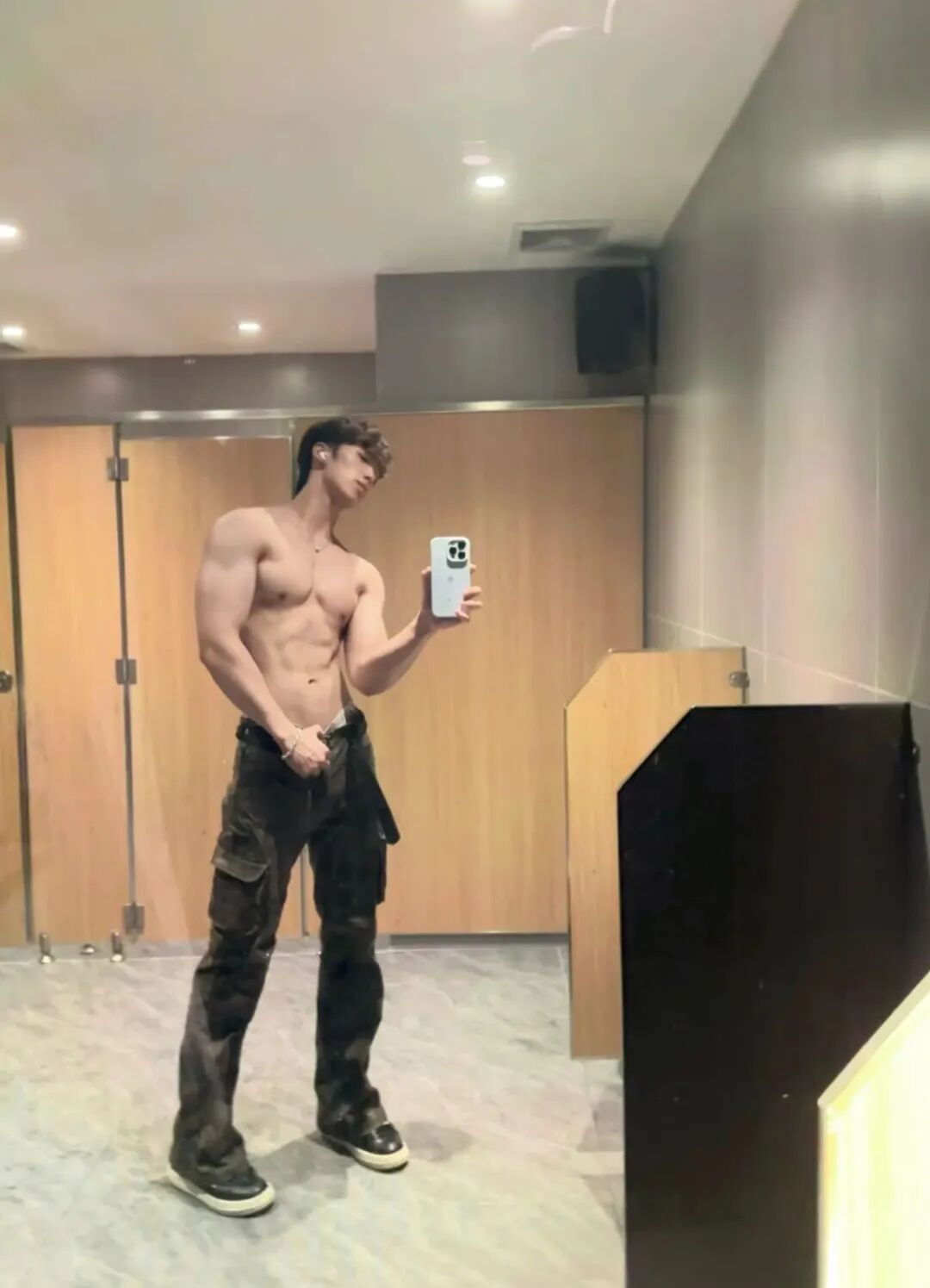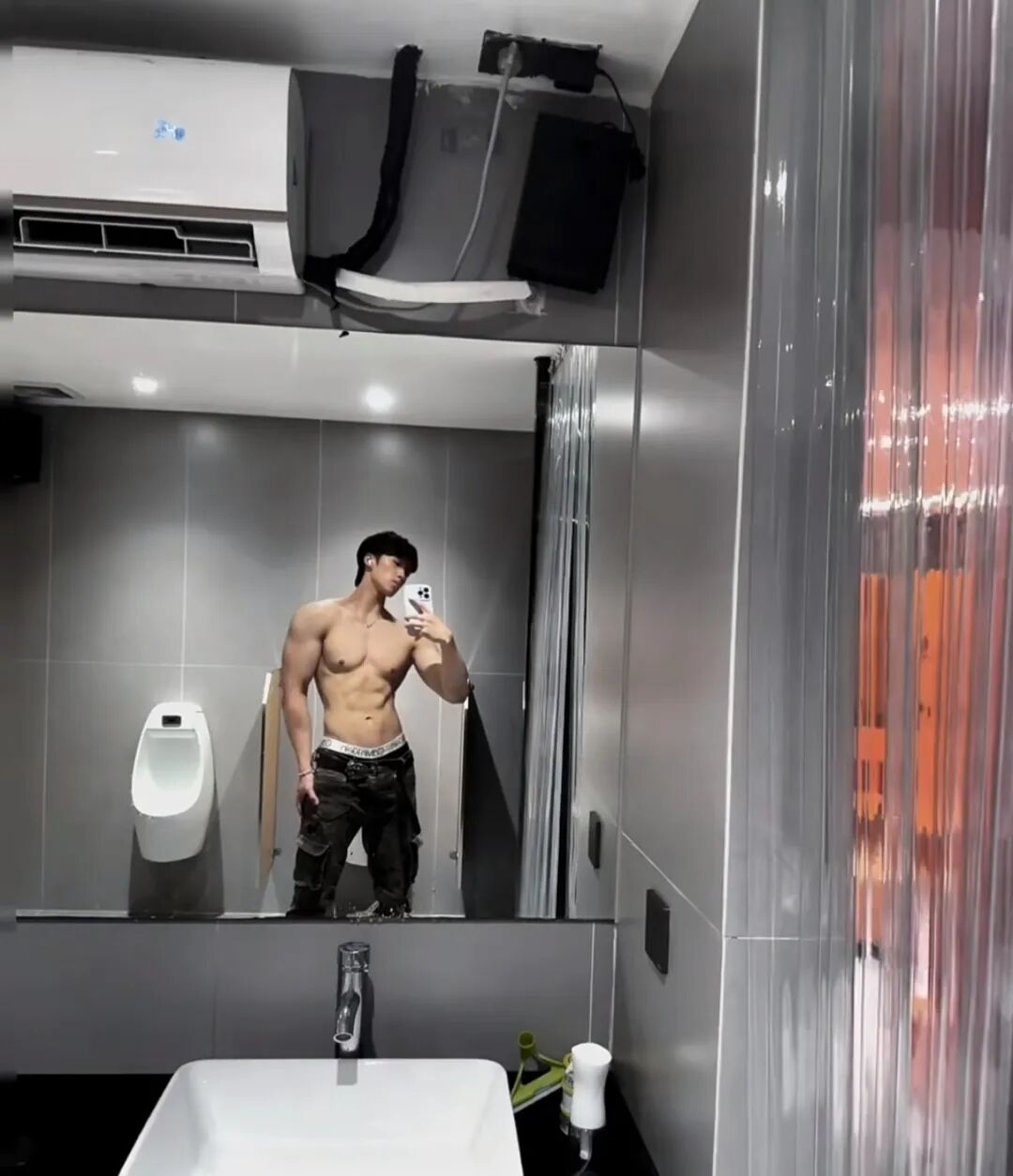 感觉这位大概率是直男而且是一个顺直,因为看到他的穿搭和体型就知道这位直男有多么的明显了!但是在厕所秀肌肉大包的体育生阿泽真的是第一次见啊!而且还将自己的裤子皮带解开。这完全是在吸引男生好吧!
