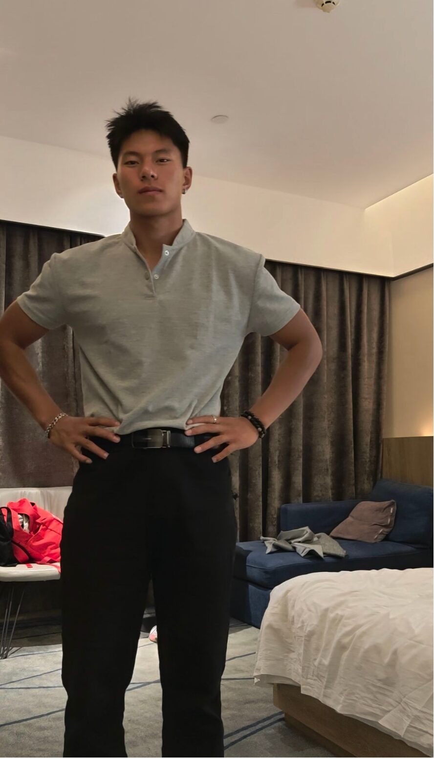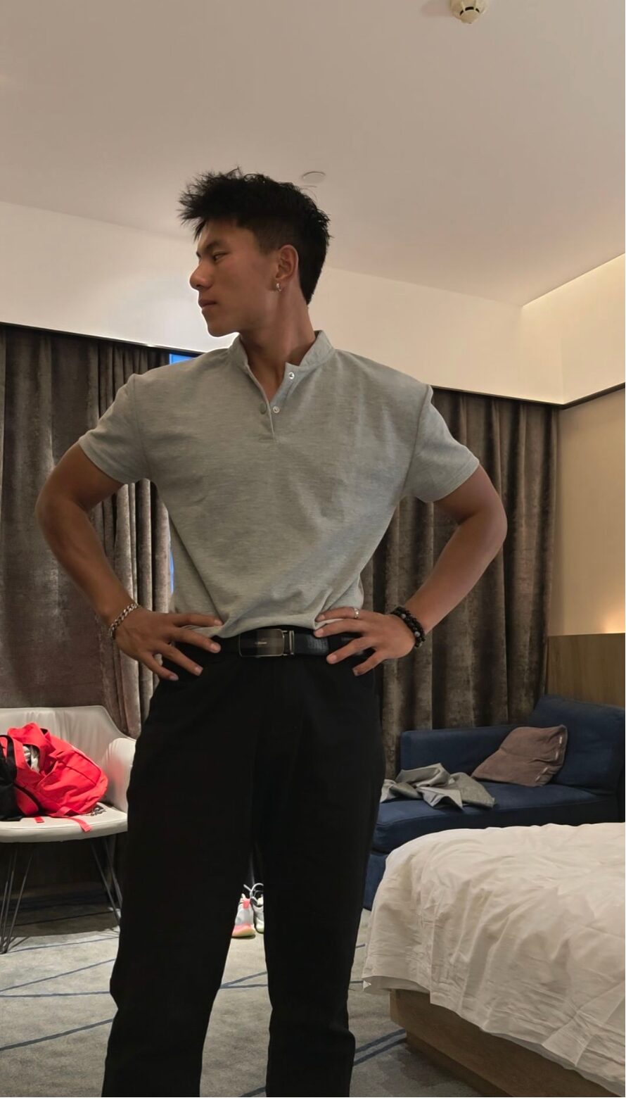 休息之际,他随意拎起了一件圆领衫套在身上。那简洁的棉布覆盖住隆起的胸廓,却掩不住肩臂贲张的力量轮廓。他的裤脚擦过结实的腓肠肌,裤管里裹着力量长存的腿骨,此刻正安静蛰伏在柔软的布料之下,犹如火山在平静地积聚炽热。