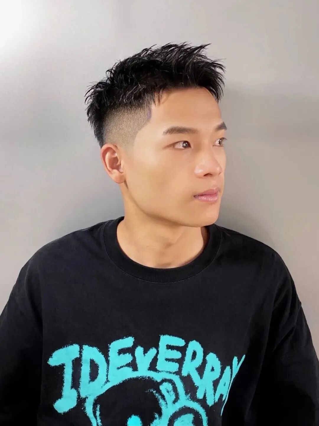 两侧的头发依旧要剪短或者铲光,头顶和刘海的头发剪碎打薄,然后打理的时候刘海的头发自然垂下并且微微分开,整体造型很简约、很有设计感,也很减龄帅气,而且还没有复杂的造型过程,对发际线高的男生也很友好!