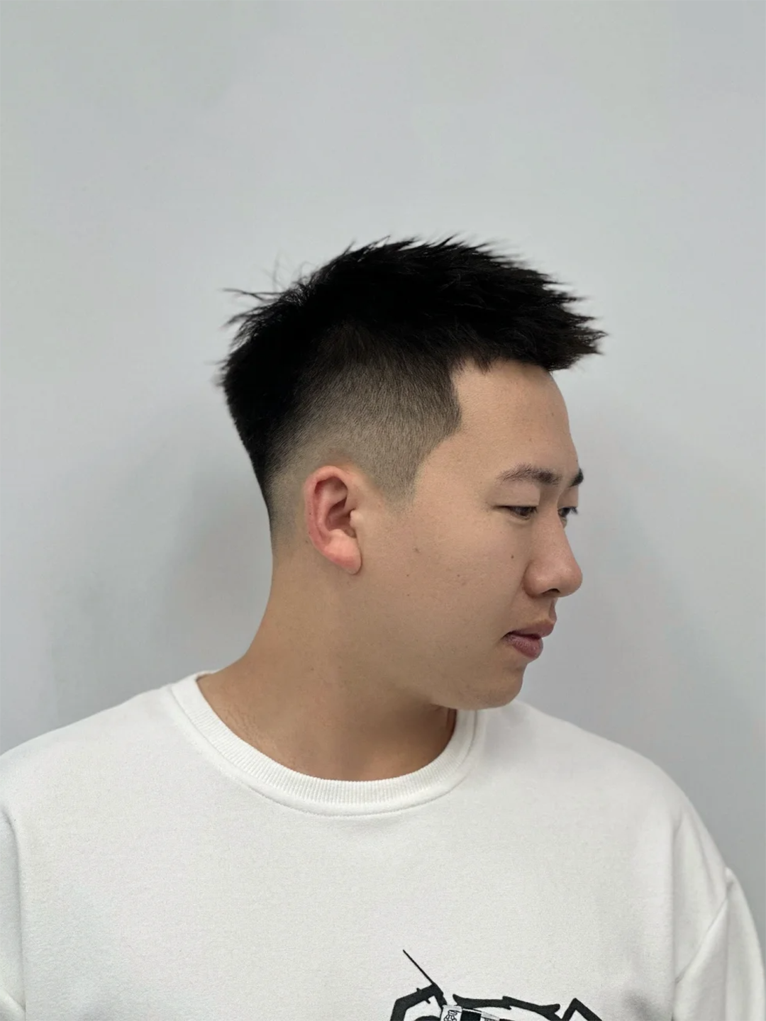 这款发型的头发长度极短,通常保留在1~3厘米之间,整体头发沿着头型剪短,几乎保持在相同的长度,呈现出一种整齐、干净的效果;侧边渐变推光,整体造型简约帅气,而且也非常百搭,值得推荐!