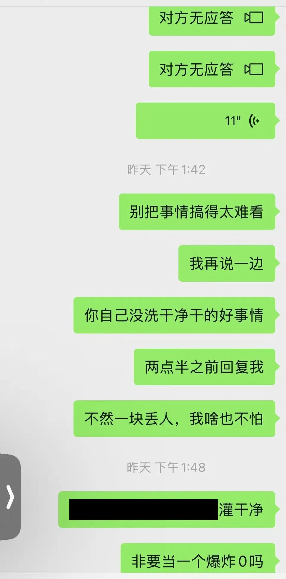 该基友在微信上愤怒地通知对方:“别把事情搞得太难看,我再说一遍,你自己没洗干净干的好事情,(下午)两点半之前回复我,不然一块丢人,我啥也不怕,你非要当一个爆炸0吗?”