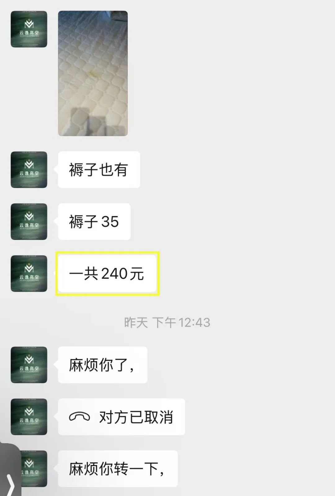 12点46分,酒店工作人员在微信上再次联系该基友说:“麻烦你了,麻烦你转一下(钱)”。根据酒店的规定,这些被人为弄脏的床上用品,可能无法送到清洁公司进行清洗,只能做报废处理,所以费用得由房客来承担。