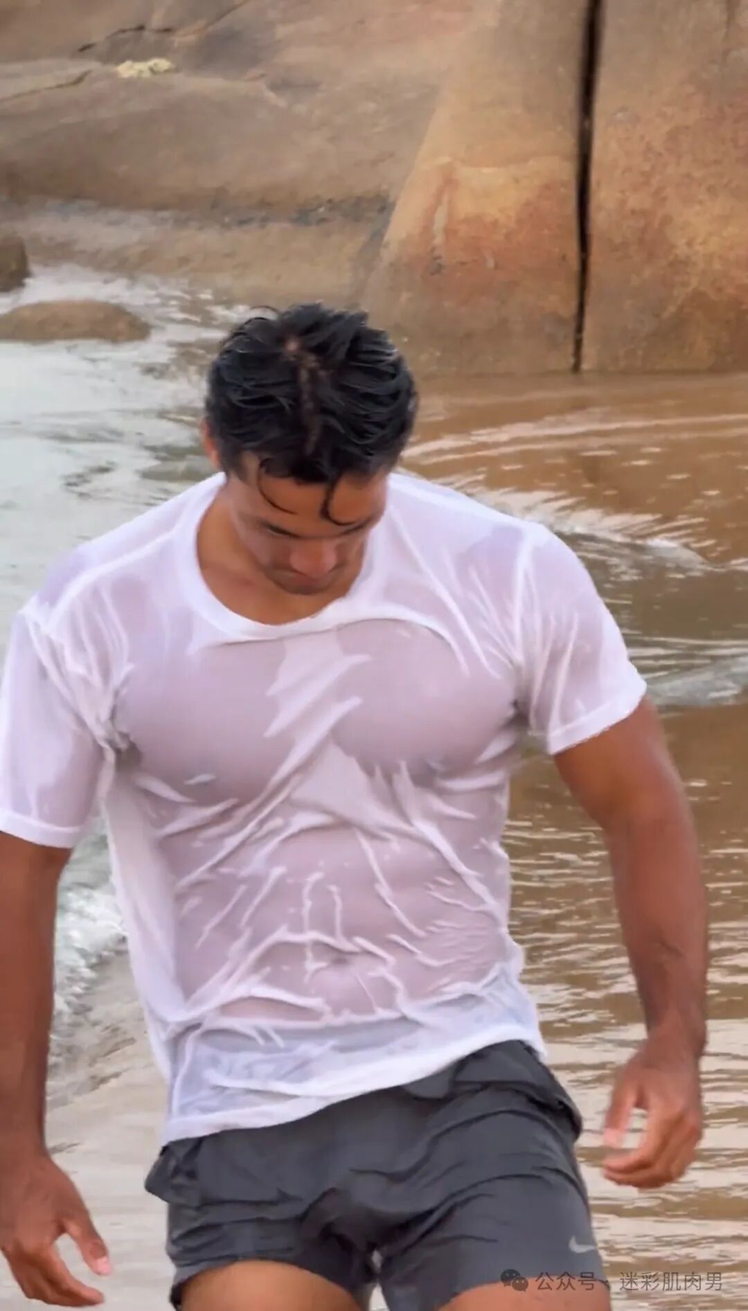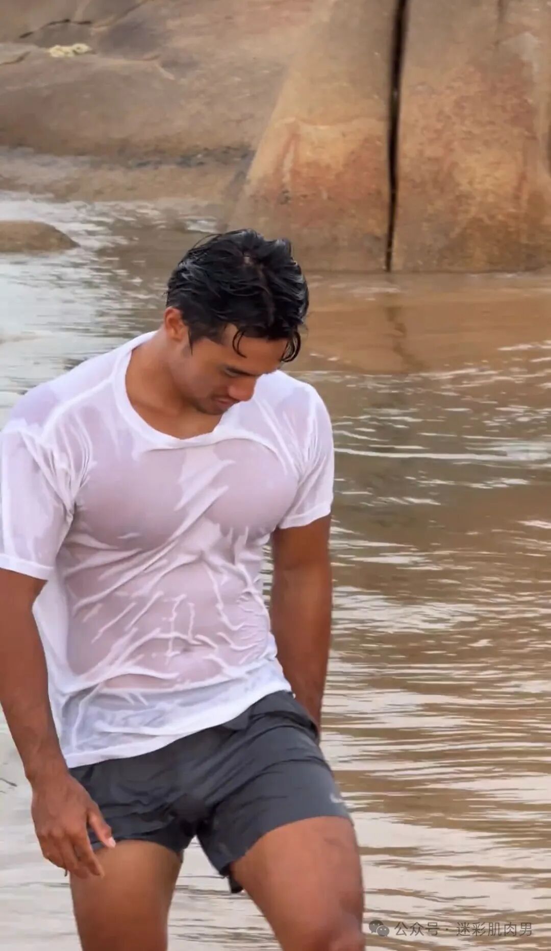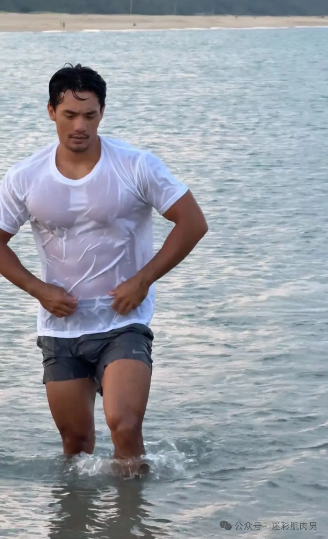 以一身黝黑发亮的肌肤与雕塑般的肌肉线条,成为自然与力量交融的具象化身。他的肤色并非刻意晒制,而是长期户外运动与海岛阳光共同镌刻的勋章。当湿透的白色T恤紧贴胸膛时,饱满的胸肌与刀刻般的腹肌在布料下若隐若现,海水顺着肌肉沟壑滑落的瞬间,既是对男性荷尔蒙的极致诠释,也呼应了海南本土文化中“逐浪而居”的原始生命力。这种视觉张力,正如海南台风季的狂野与宁静交替——既有风暴般的冲击力,又饱含热带阳光的治愈感。