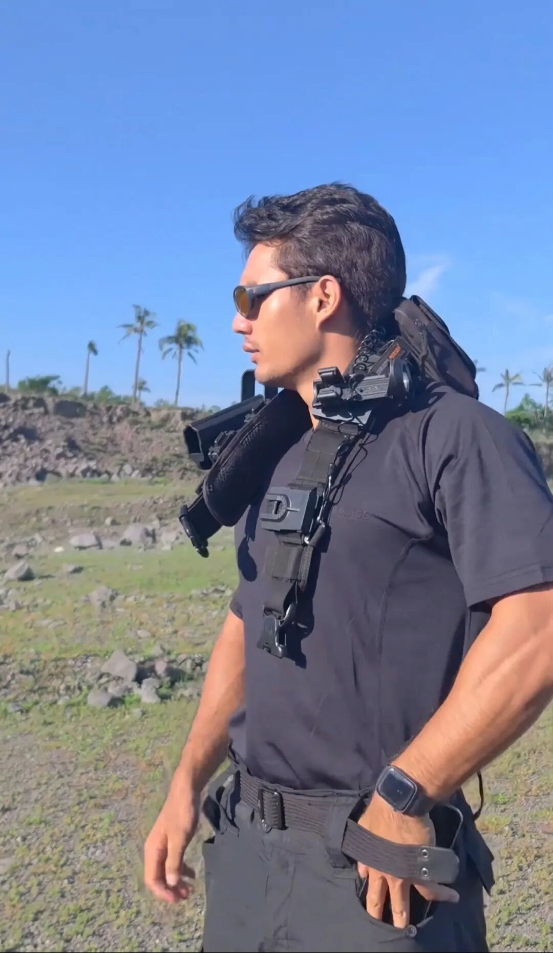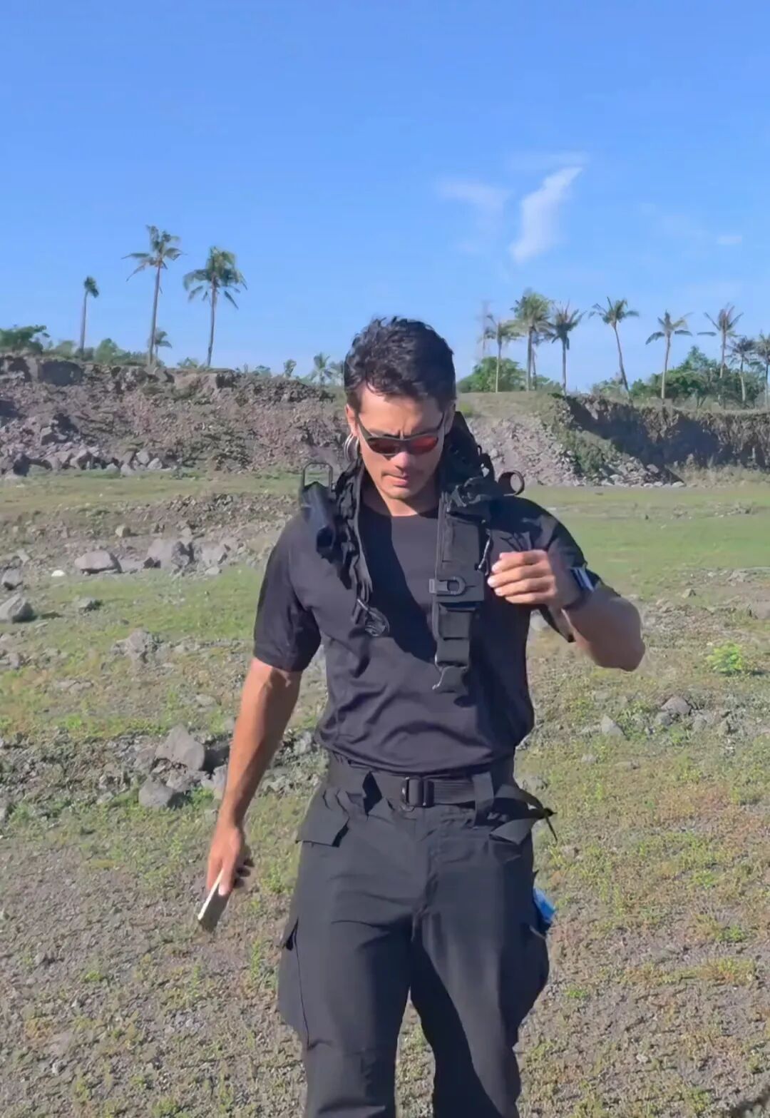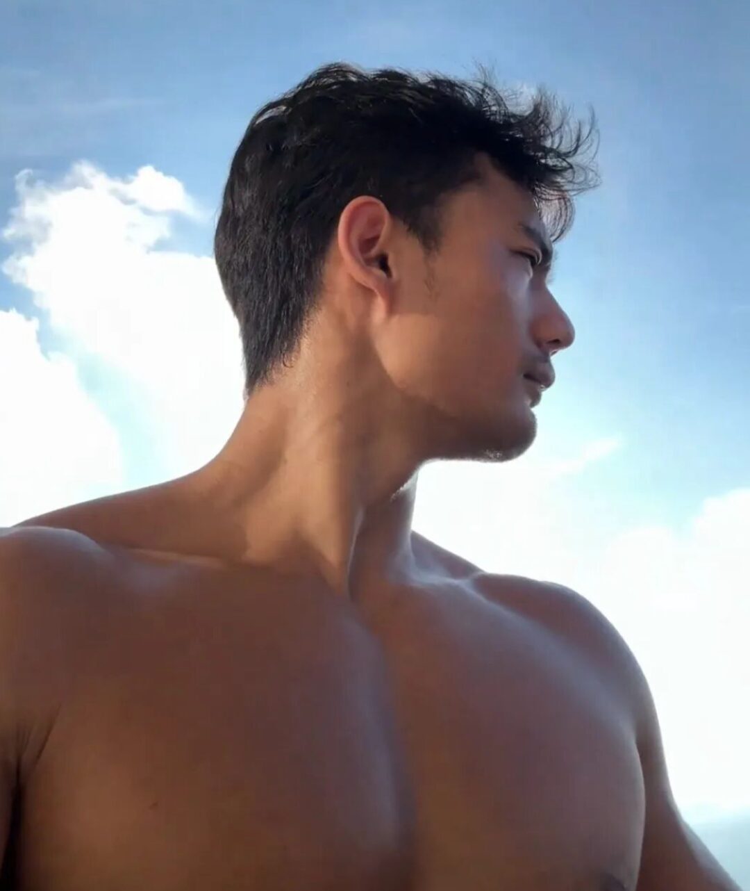 以一身黝黑发亮的肌肤与雕塑般的肌肉线条,成为自然与力量交融的具象化身。他的肤色并非刻意晒制,而是长期户外运动与海岛阳光共同镌刻的勋章。当湿透的白色T恤紧贴胸膛时,饱满的胸肌与刀刻般的腹肌在布料下若隐若现,海水顺着肌肉沟壑滑落的瞬间,既是对男性荷尔蒙的极致诠释,也呼应了海南本土文化中“逐浪而居”的原始生命力。这种视觉张力,正如海南台风季的狂野与宁静交替——既有风暴般的冲击力,又饱含热带阳光的治愈感。