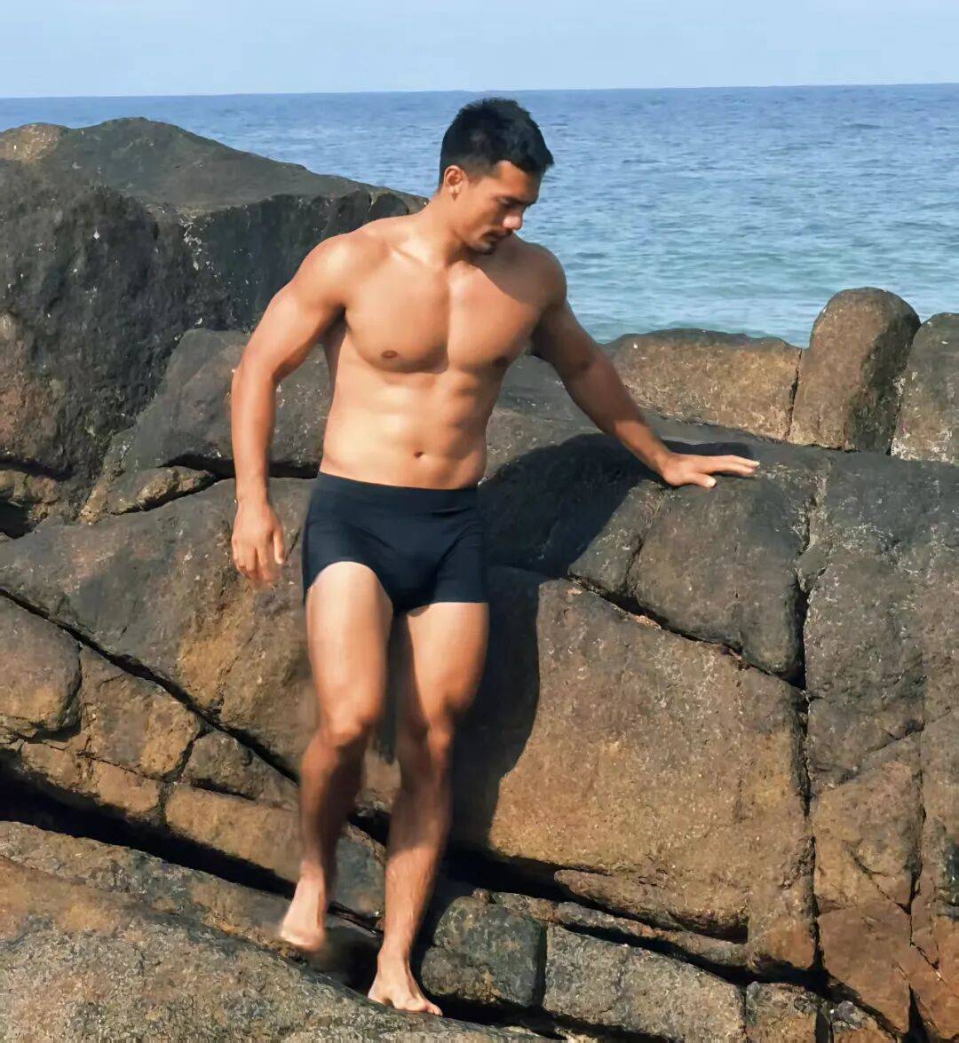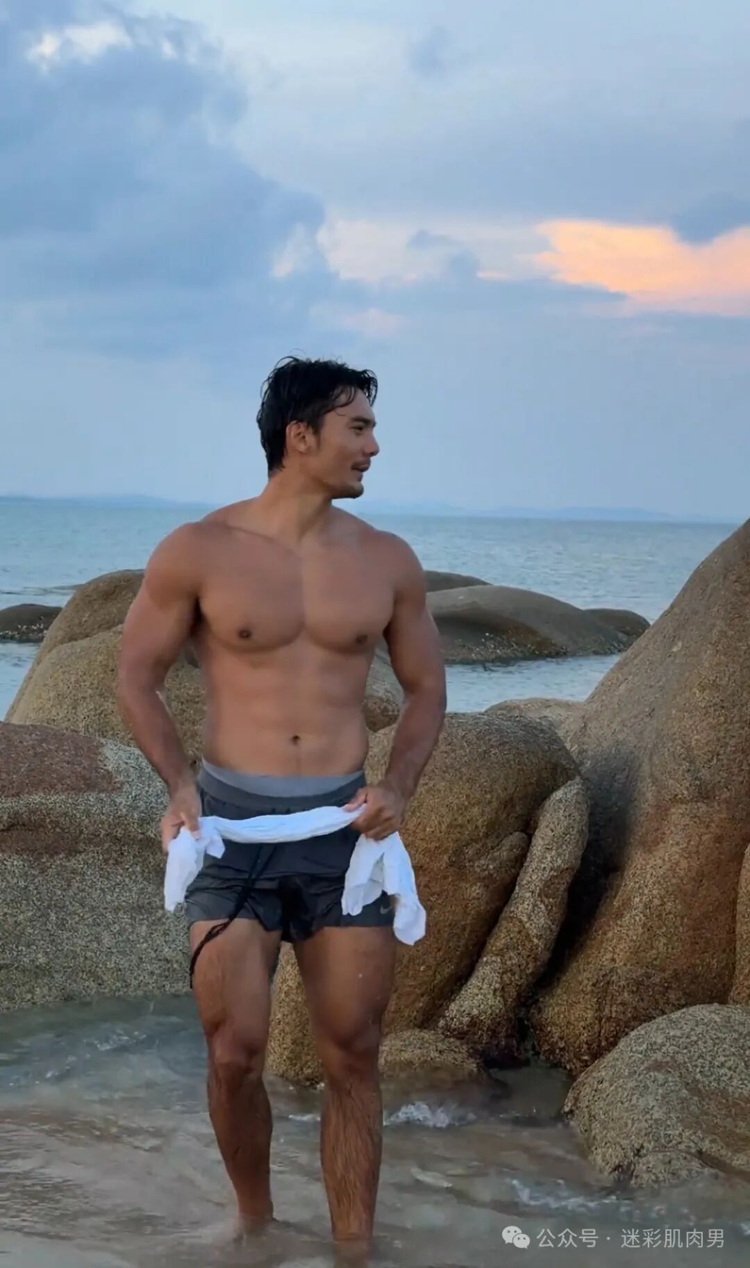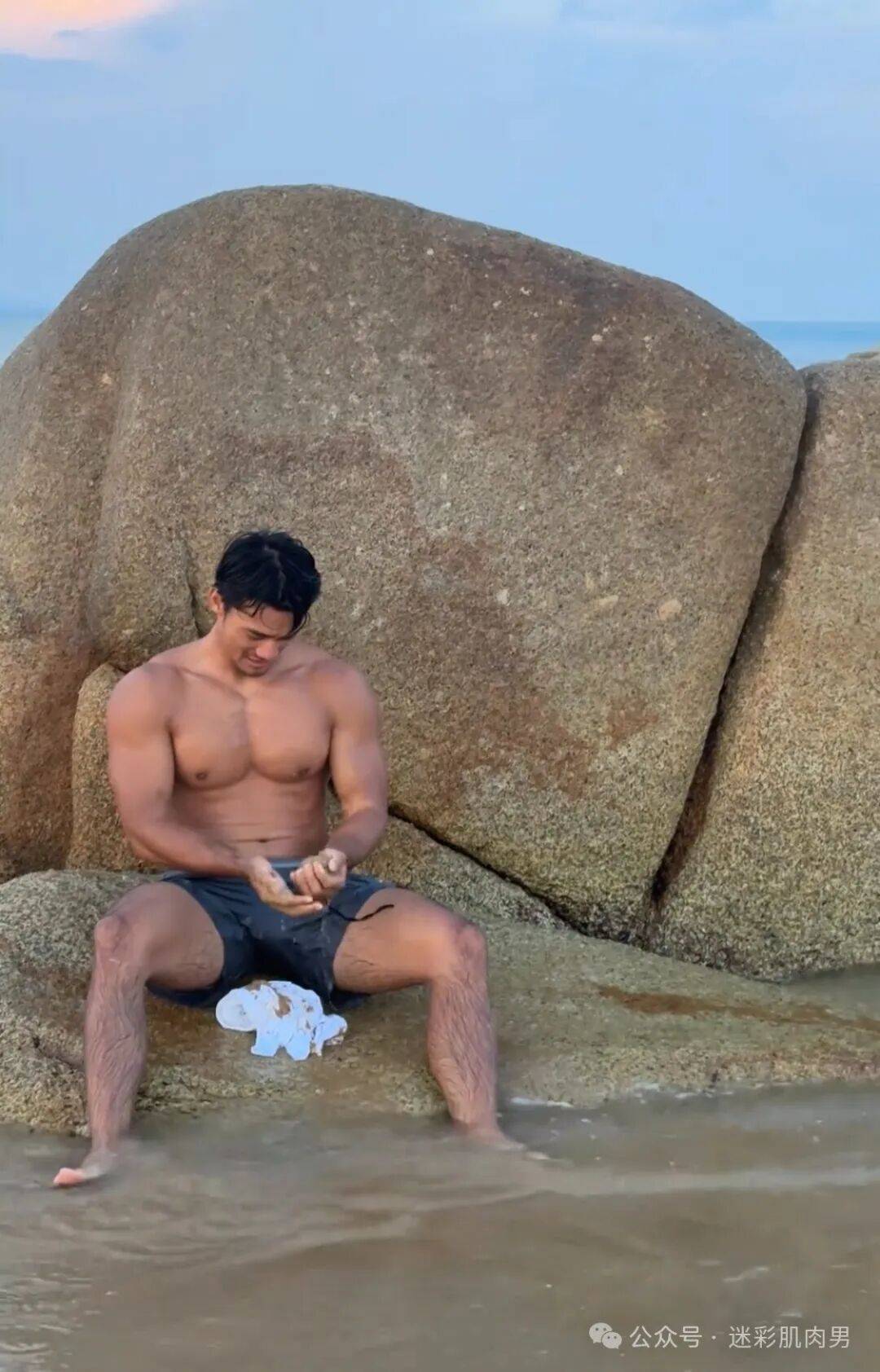 他的粗壮长腿与短裤造型,颠覆了传统审美对“纤细”的执念。腿部肌肉在行走时隆起的力量感,与沙滩上斑驳的椰影形成动态对比,让人联想到海南渔民与海浪搏斗的坚毅身影。这种粗犷却不失协调的体型,正是长期系统性训练的成果:每周五次的力量训练结合冲浪、游泳等户外运动,使他的身体兼具爆发力与敏捷性,如同海南岛经历过台风洗礼却依然挺拔的椰树。