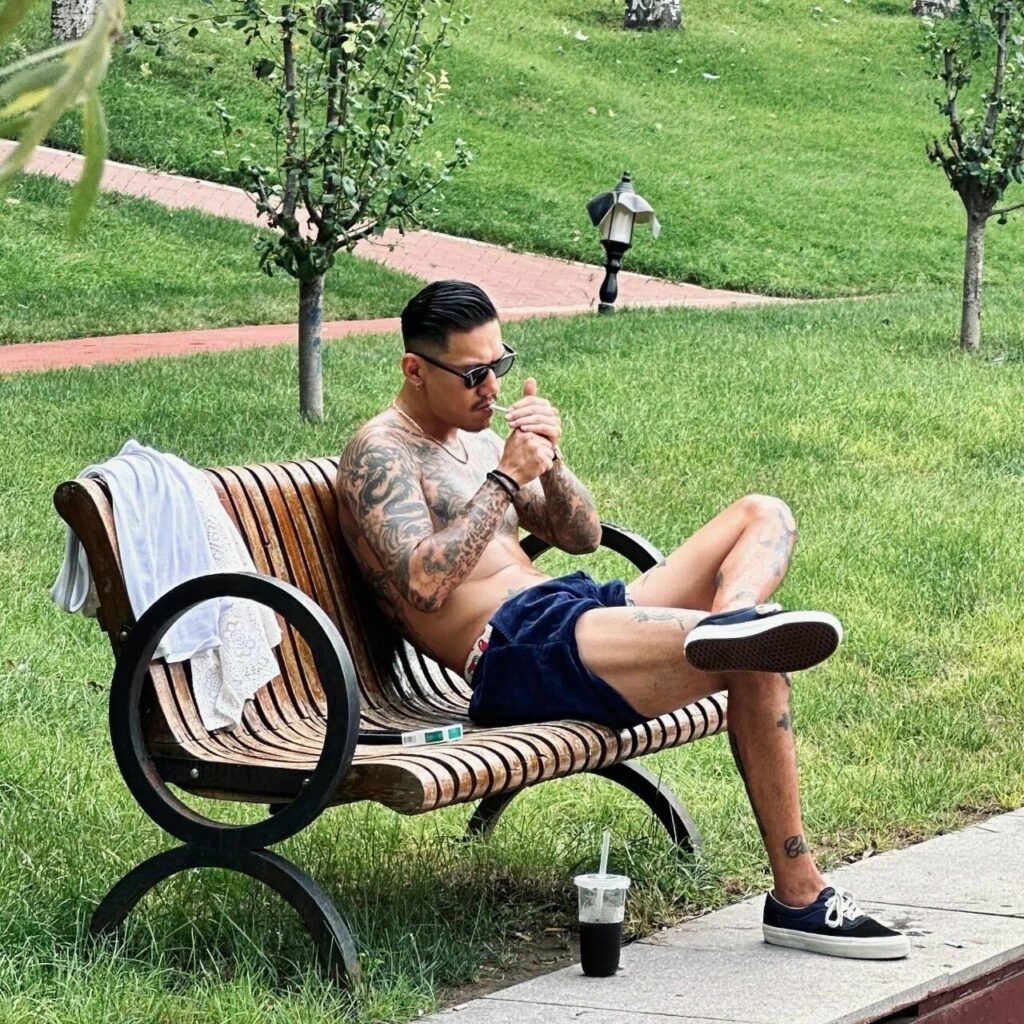 这满身的“花绣”看着就很会家暴!但不妨碍痞里痞气的点烟动作顺便把我也点着了!那一缕缕烟要是喷我脸上,我估计都能当氧气吸。讲真,我现在看那根烟非常不顺眼,它凭什么能被你含在嘴里又吸又咬的?能不能懂点事自己灭了?换我来行不行?我挺耐抽的。