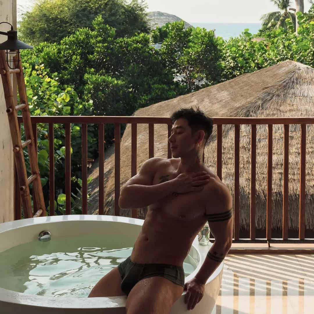 不仅是无边泳池,邓涵洧还爱上了酒店浴缸作为拍照背景。很多人可能觉得浴缸拍照太普通,但邓涵洧却用他那极具视觉冲击力的肌肉线条,配合独特的光影效果,轻松打造出一系列让人眼前一亮的湿身大片。