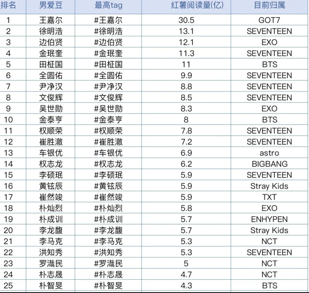 权志龙和车银优能够在内娱榜单里挤进前三,足可见两位男爱豆在中国的人气和影响力有多大了。王嘉尔表现更是抢眼。尽管去年因抑郁症休息了一年,但是在KPOP领域仍旧留有他的一席之位。不管是人气还是影响力,都只增不减。