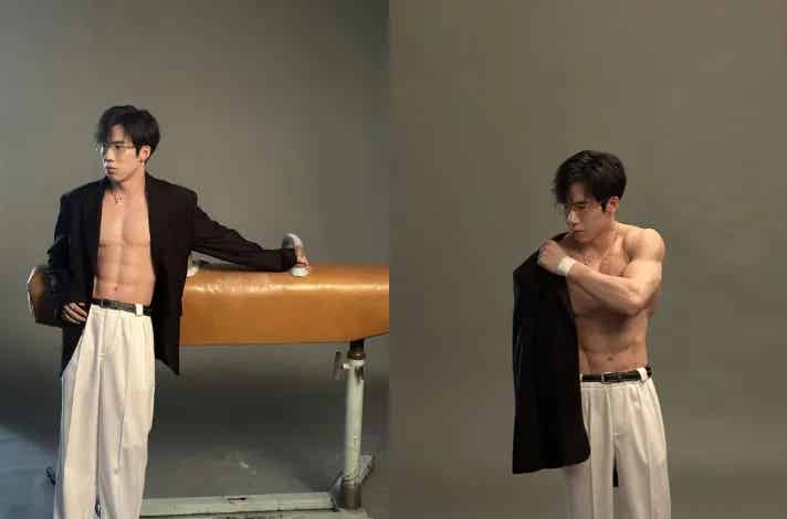 当我们把目光投向他那令人惊叹的身材时,会被他那发达的肌肉所震撼。他的胸肌如同坚固的盾牌,有着恰到好处的纬度,彰显着力量与美感的完美结合。那雕刻般的八块腹肌,每一块都像是经过精心打磨的玉石,线条分明而又充满力量。粗壮的手臂肌肉,那是他在单杠、双杠等项目上挥洒汗水的见证,是他一次次撑起自己身体,完成高难度动作的力量源泉。