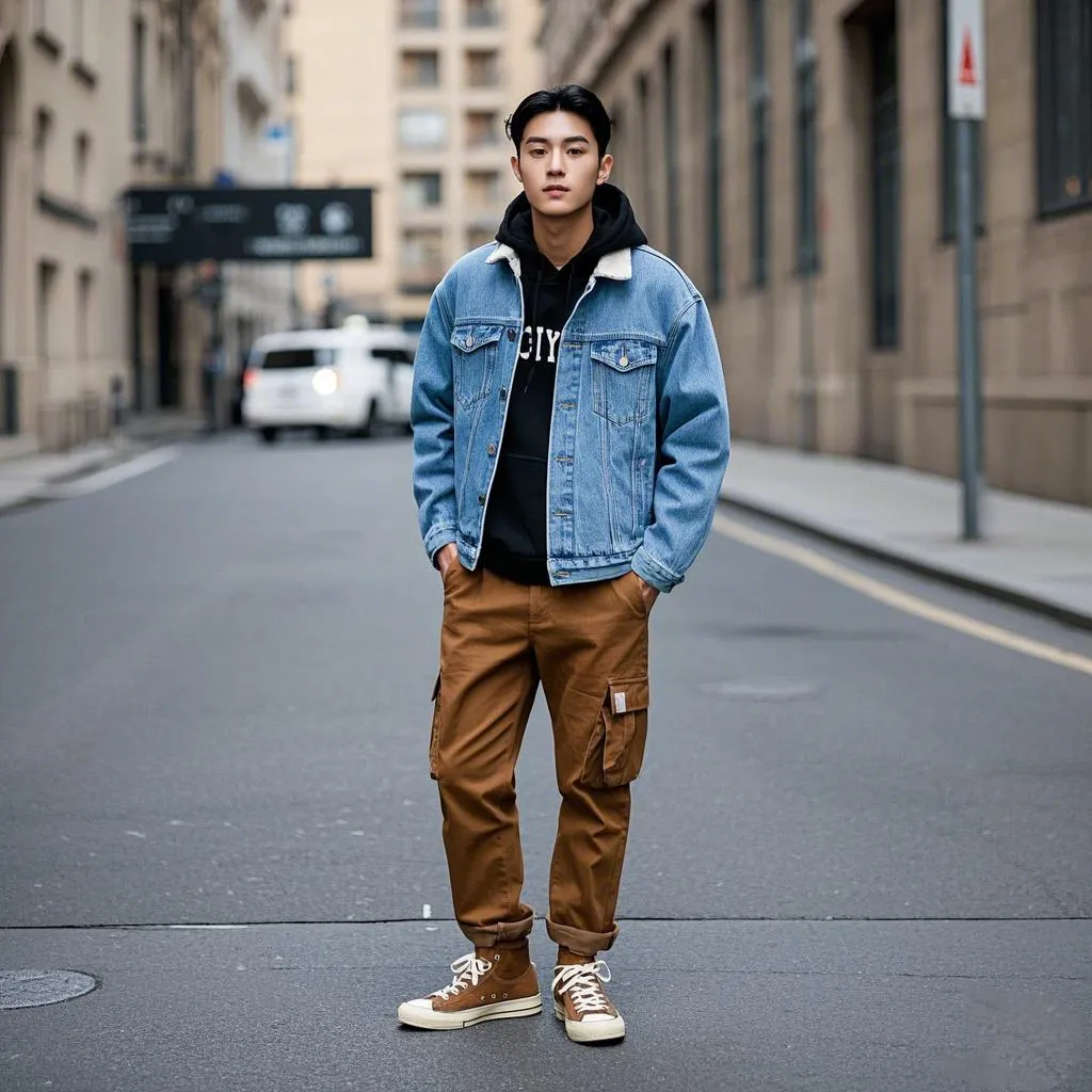 在男生的时尚穿搭领域中,“牛仔外套+卫衣”的组合堪称经典且极具魅力,展现出丰富多元的风格特色,而且很时尚百搭,几乎所有的男生都适合穿!今天,阿北就给大家带来3套潮流帅气的“牛仔外套+卫衣”搭配,大家跟着穿就对了!look1:蓝色牛仔外套+黑色卫衣+棕色工装裤+棕色帆布鞋