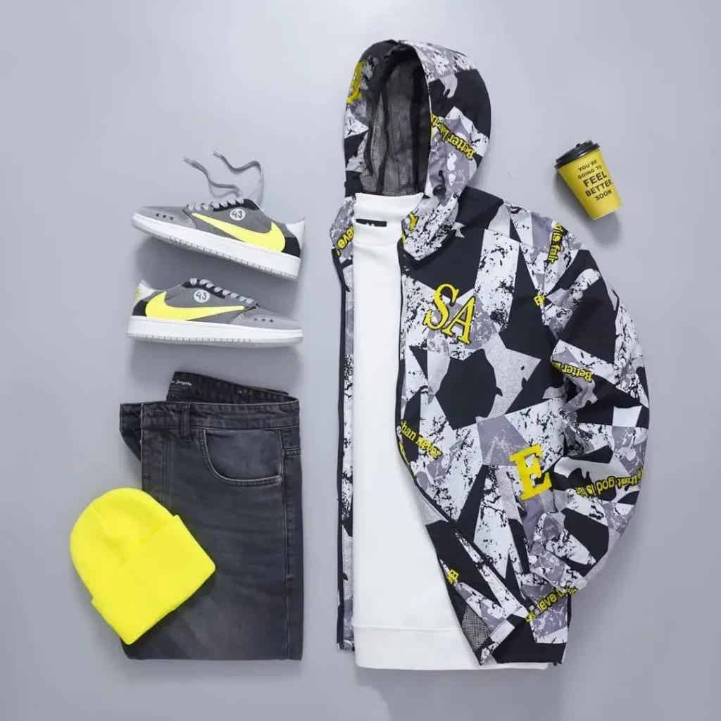 搭配要点:黑灰花色连帽夹克,黑灰相间的花色营造出沉稳又不失个性的氛围。内搭白色卫衣,凸显层次感。黑色牛仔裤经典百搭,配上灰色板鞋,低调中融合整体色调,尽显时尚品味。
