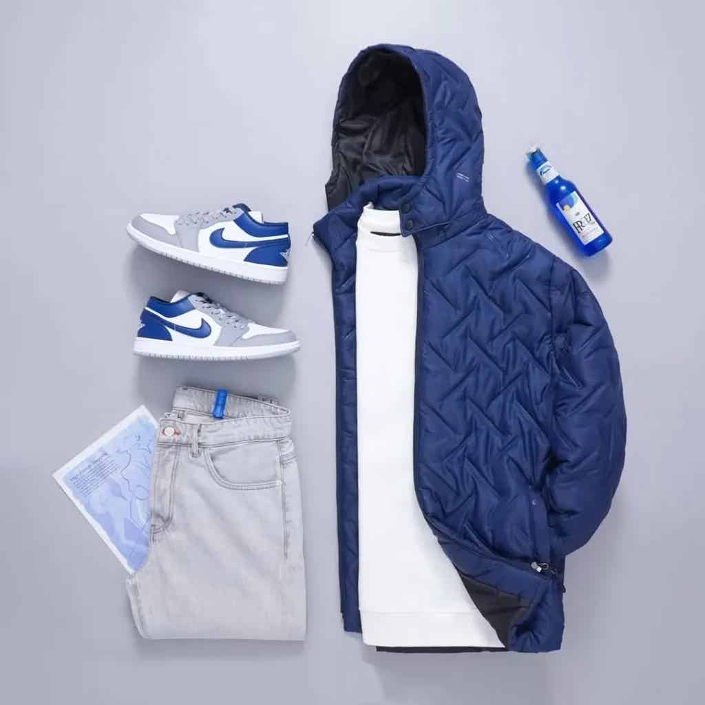 搭配要点:灰色假两件设计,层次感十足,连帽更添休闲感,内搭白色卫衣,纯净的白色与灰色夹克凸显清新气质,下身搭配灰色牛仔裤,色调统一且协调,再配上白色板鞋,干净简约,呼应白色卫衣。look2:蓝色连帽羽绒服+白色卫衣+浅灰牛仔裤+白蓝撞色板鞋