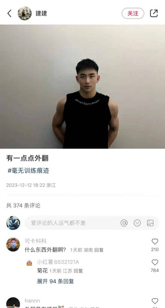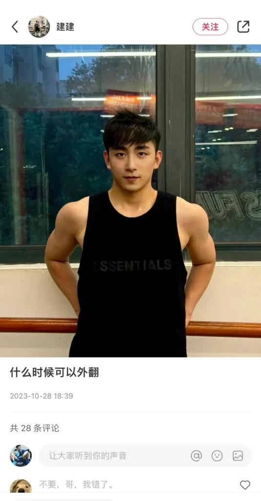 一个来自杭州的小红薯博主@建建,一个26岁的年轻有活力的小哥。身高185,体重73,拥有完美身材的他是体育生,还是兼职模特哦!