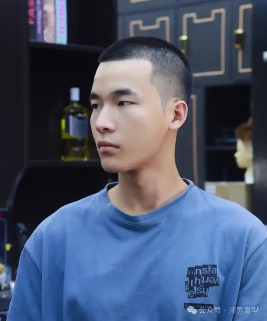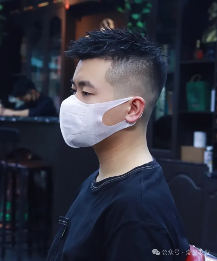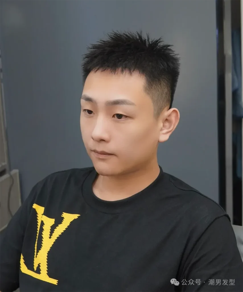 这也是一款比较个性的男士短发,对于一些发量稀疏、细软的男士也很合适,通过钢夹烫的方式把头发烫出些蓬松度,既可以增加头发的弹性,又可以增加头顶头发的高度,周边头发渐层剃短,从而让脸型看起来更有立体感,打理造型的时候刘海稍微吹翘起,这样整个发型看起时尚有型,简约又大气。第四款:寸头发型